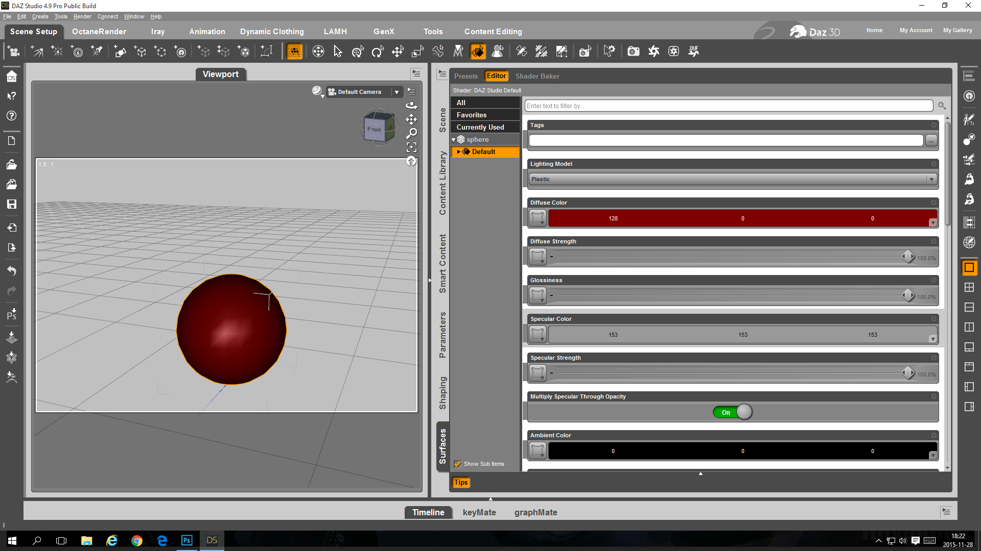- In the DAZ Studio surface tab switch the diffuse color of the sphere to red