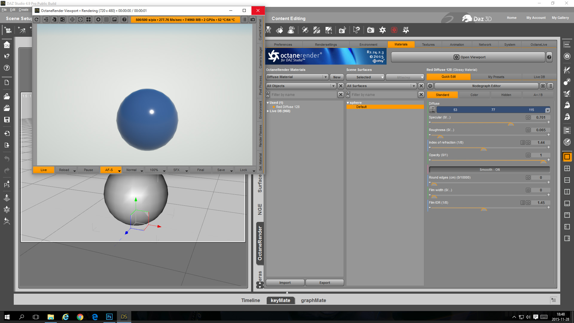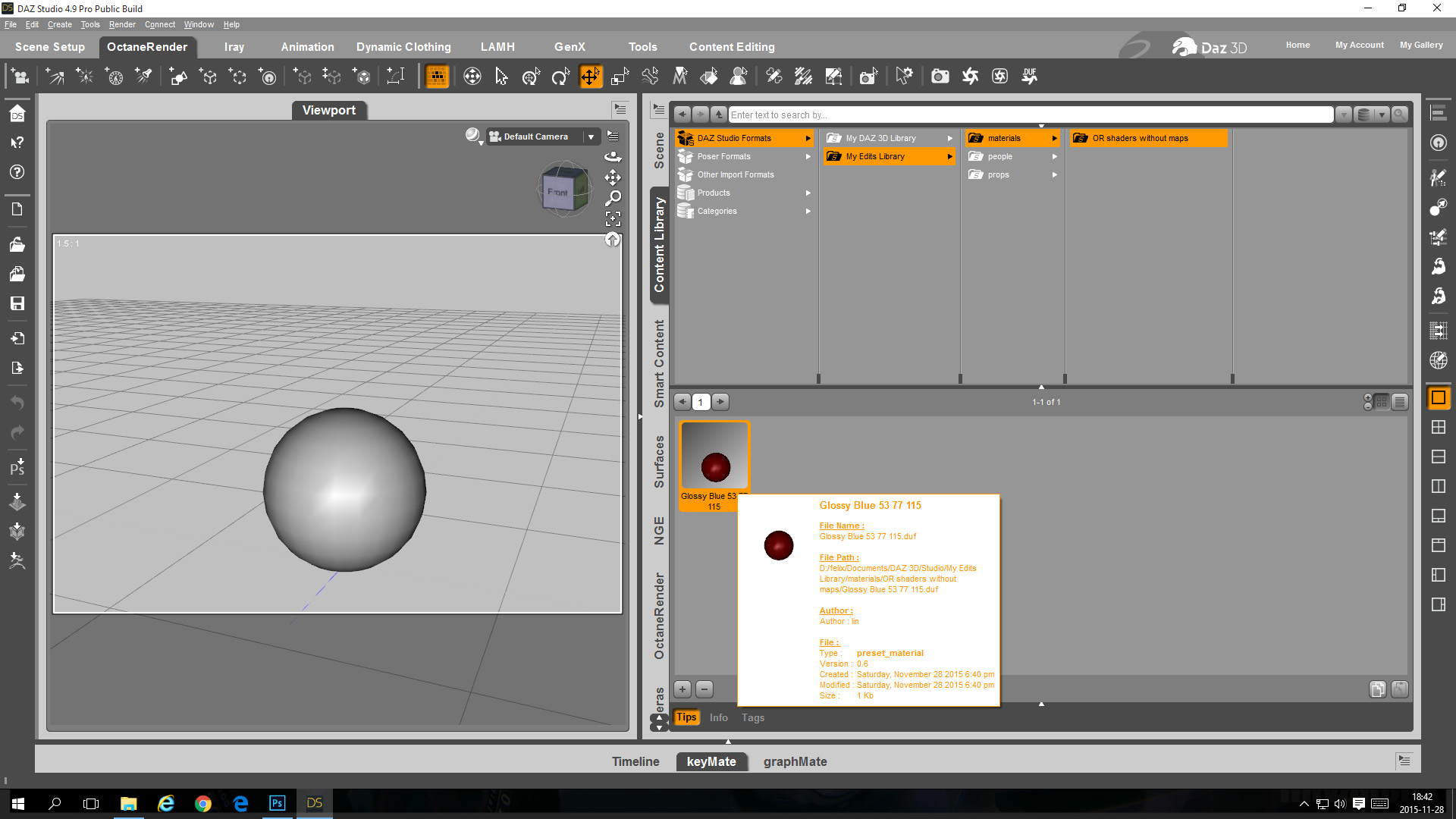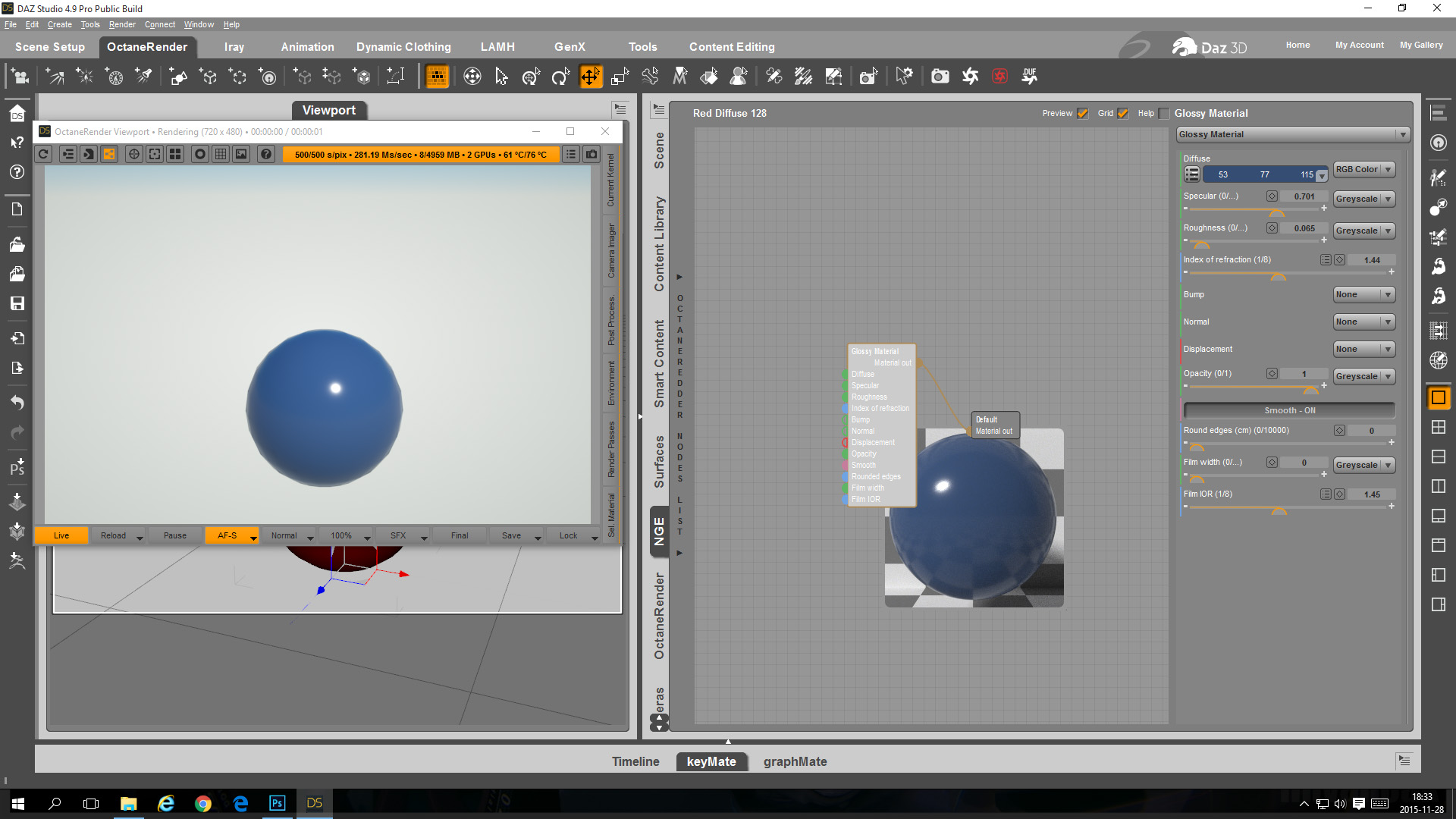 - In the OcDS Node Graph Editor change the sphere material to a blue glossy material