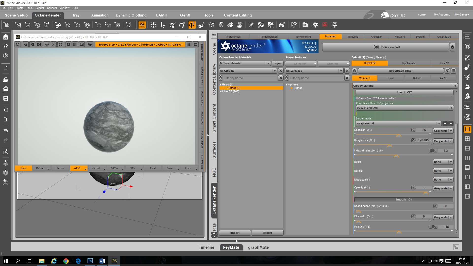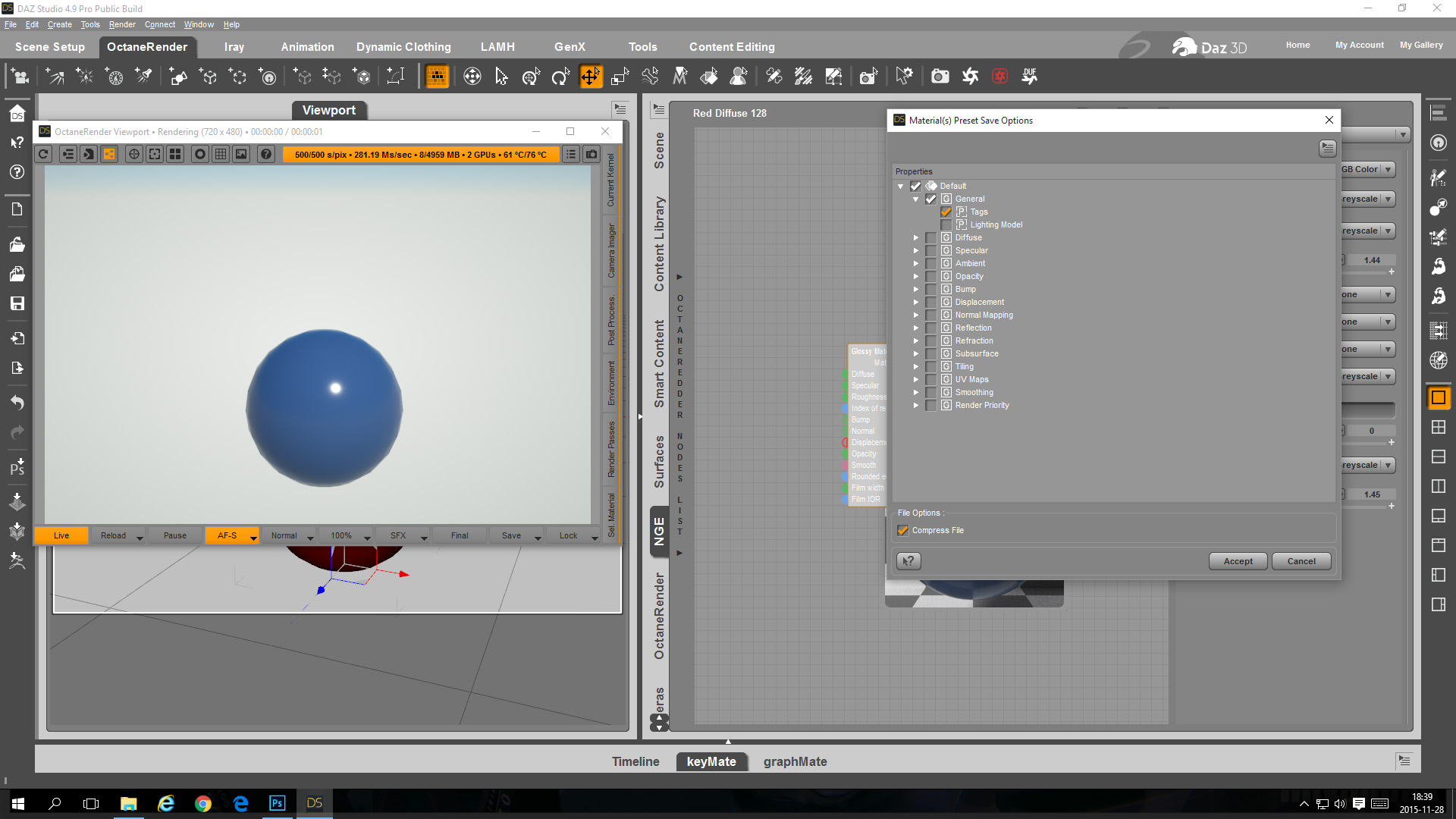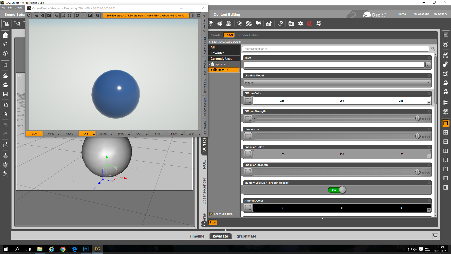 - In the OcDS Node Graph Editor change the sphere material to a blue glossy material