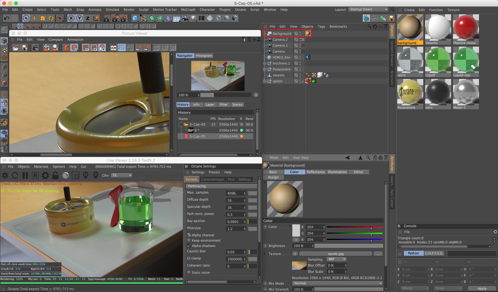 The trick is to add a c4d background object and assign to it a standard c4d material with the proper texture in the color channel. Then you can see and render the full fram in both Live View and Picture Viewer without having to compose it later on ;)