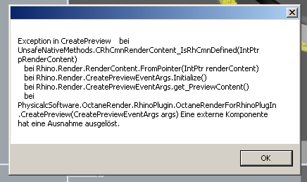 This looks like an exception occurring inside the Rhino RDK. Are you able to give me a set of steps so I can try to reproduce this error pls?Paul, please add an option to disable the message, that Octane needs to be enabled to get the right material preview. Please add a little flag option at the material info message like "never show this message again".
