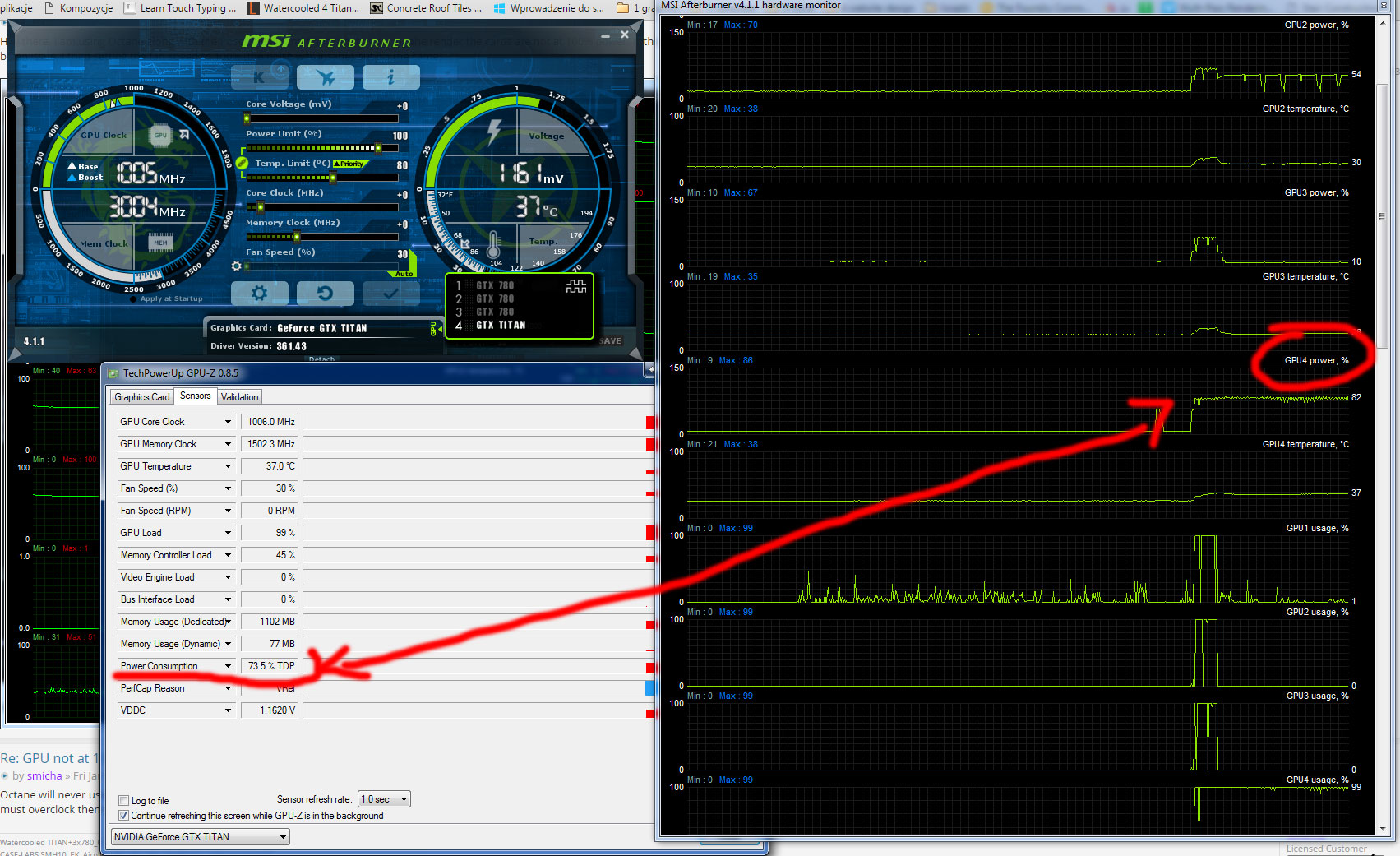 OC titan to 1250mhz indicates 88% of power, 7806gb OC to 1300Mhz 77%.
