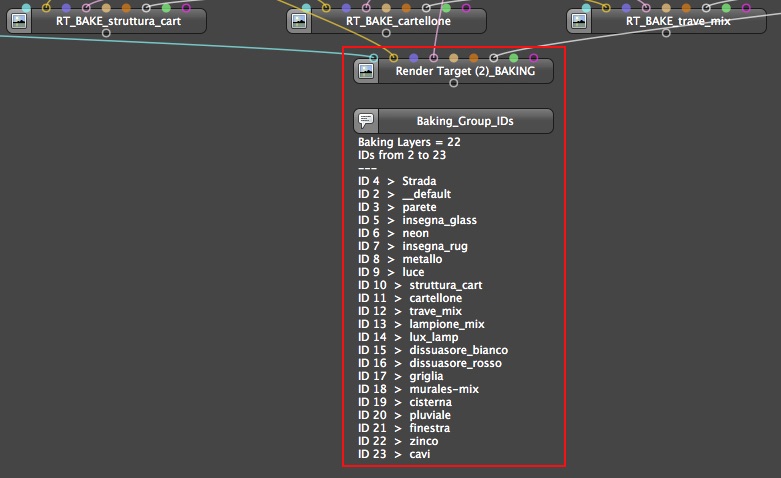 If the script is opened in the Script Editor window, almost on top, it is possible to change some default values for the baking cameras, then, if the script is saved, it can be execute directly from the script menu with the desired default values. After the script has been executed, double click the new node graph just below the render target previously selected. At the center of the node graph should be visible the generic copy of the render target and an annotation node that stores all the materials with the proper baking ID. By selecting the generic copy, is possible to fine tune all the settings, like resolution, render passes, kernel settings and so on. Since they are shared with all the other baking render targets, when finished, just select the default Batch rendering script to render all the textures in one go.