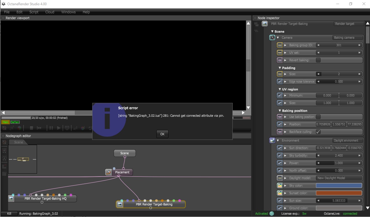 Little update to metch to the new OctaneRender™ v3 aplha 4 version with displacement enabled during Baking: For OctaneRender v3 Alpha 3 or below, please continue to use the old 1.9 version: The idea is to select an obj mesh node and the render target already set up previously and then run the script. The result should be a new node graph with all the necessary copies of the original nodes to automate the baking process, in this way the original scene is not touched and we can adapt the nodes, for example disabling any displacement node in the materials since is not currently supported by the baking feature. For every pin material of the mesh node, the script generate an object layer node and a new render target with a specific baking camera with proper attributes.