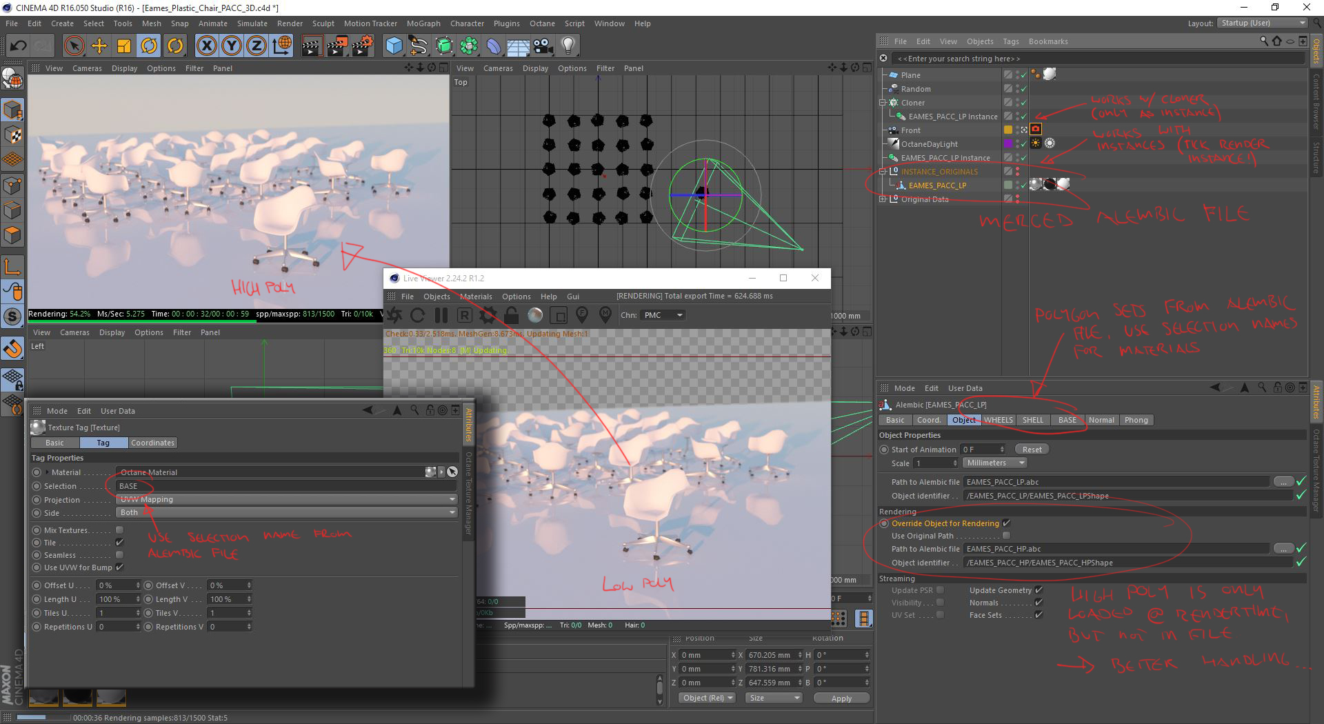I did a small scale test, which worked out with some adjustments (object identifier needs to be set by hand, the "render instances" box in cloners doesn't work, you have to place an instance into the cloner). The big advantage to me is, that I can work with really light geometry, and don't need to switch around/toggle visibilities. Now live viewer renderings show the lowpoly version, which is usually enough to set the lighting etc. Test renderings in the picture viewer show the detailed model.