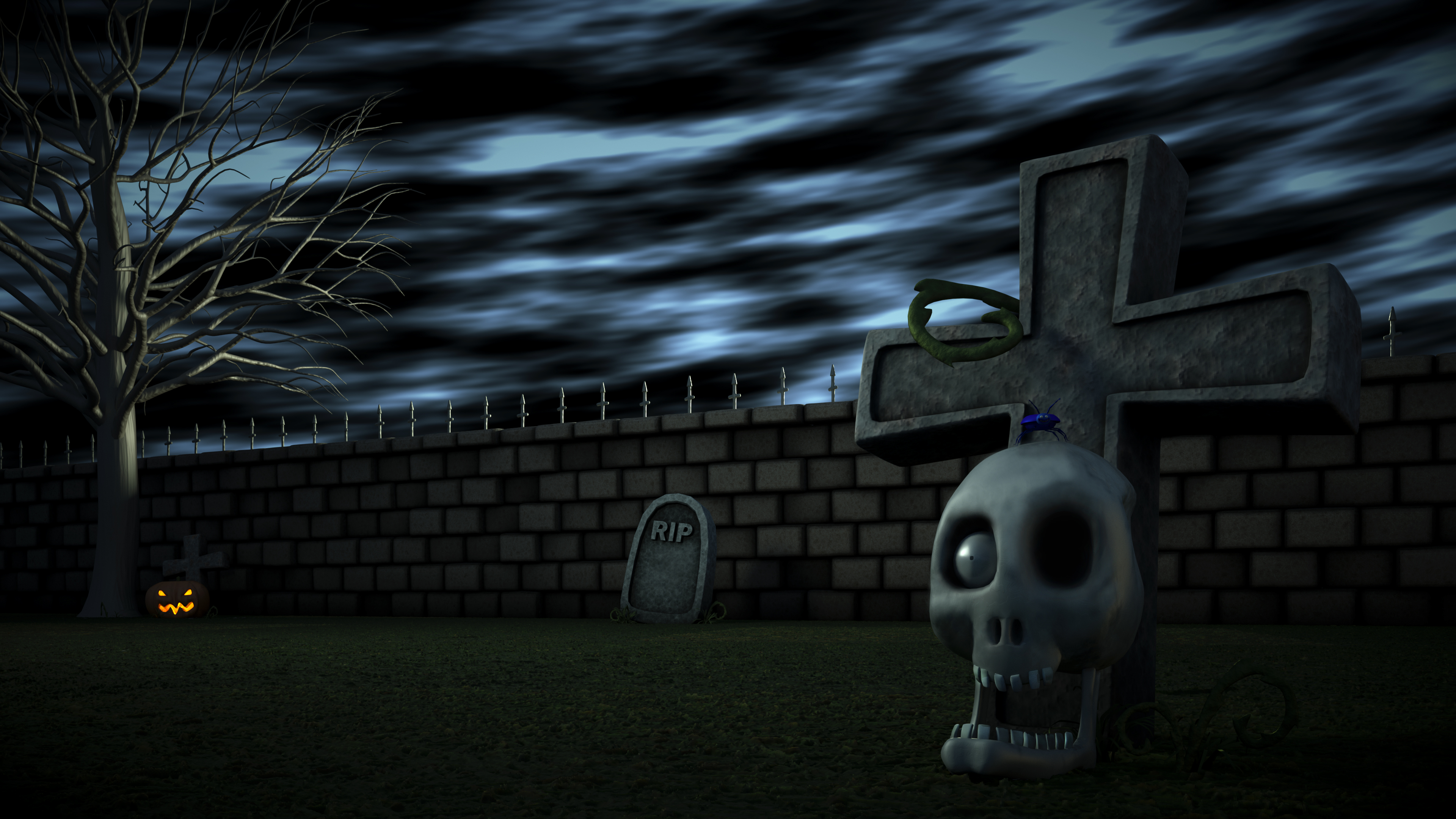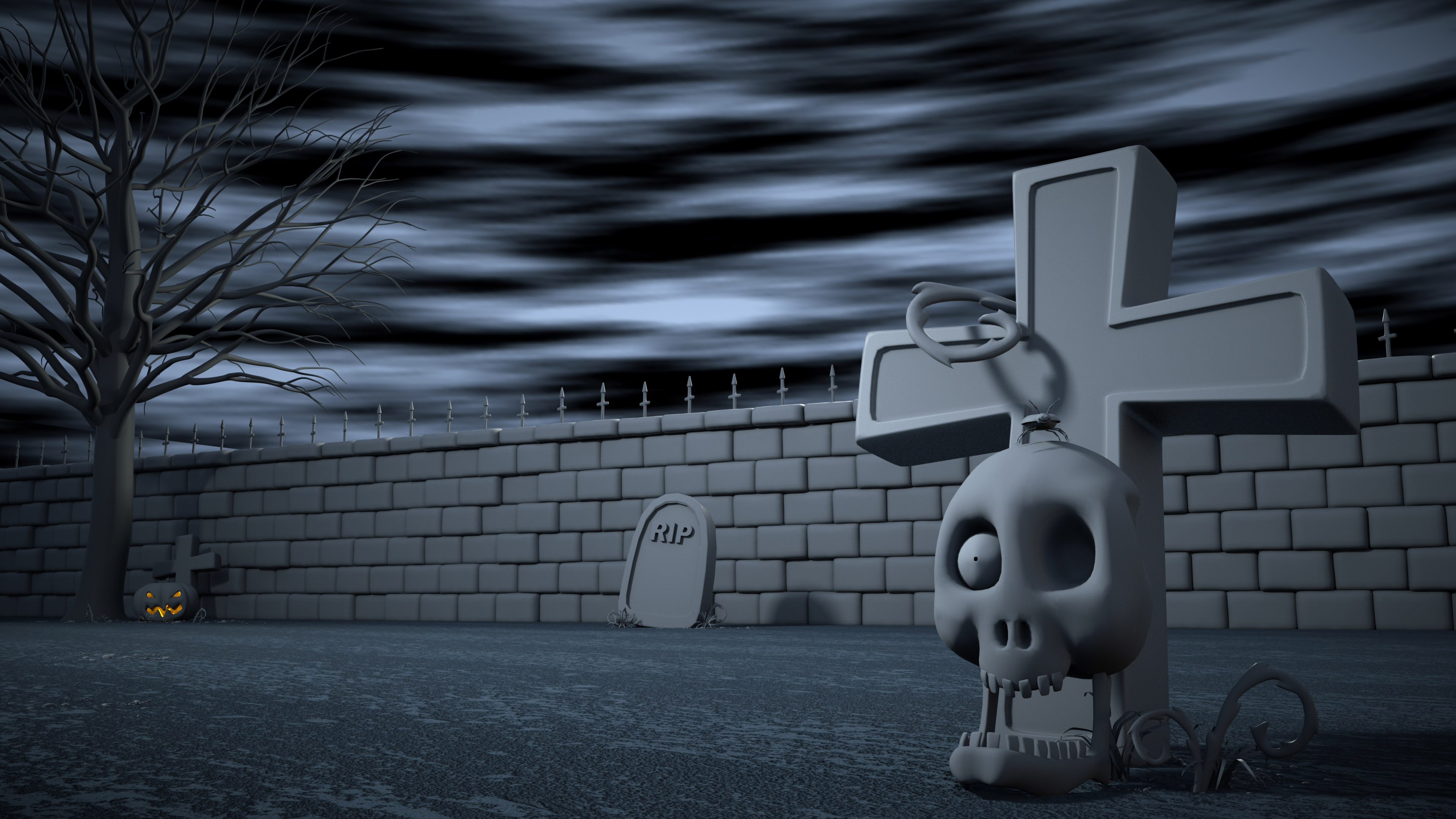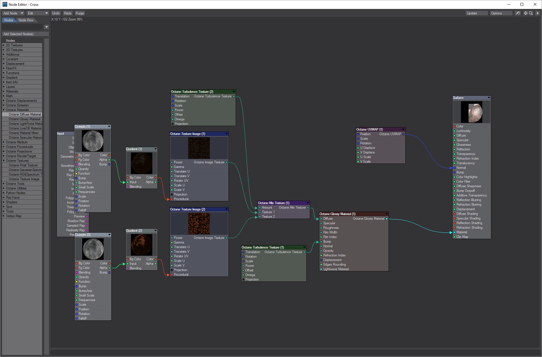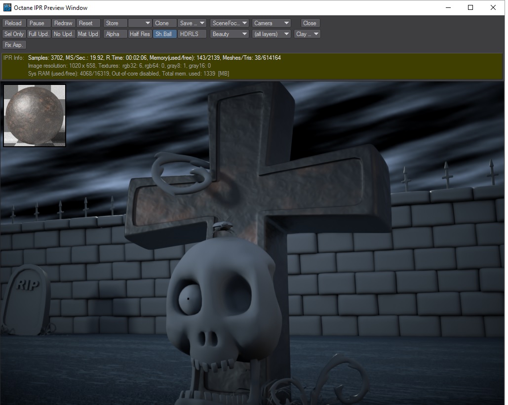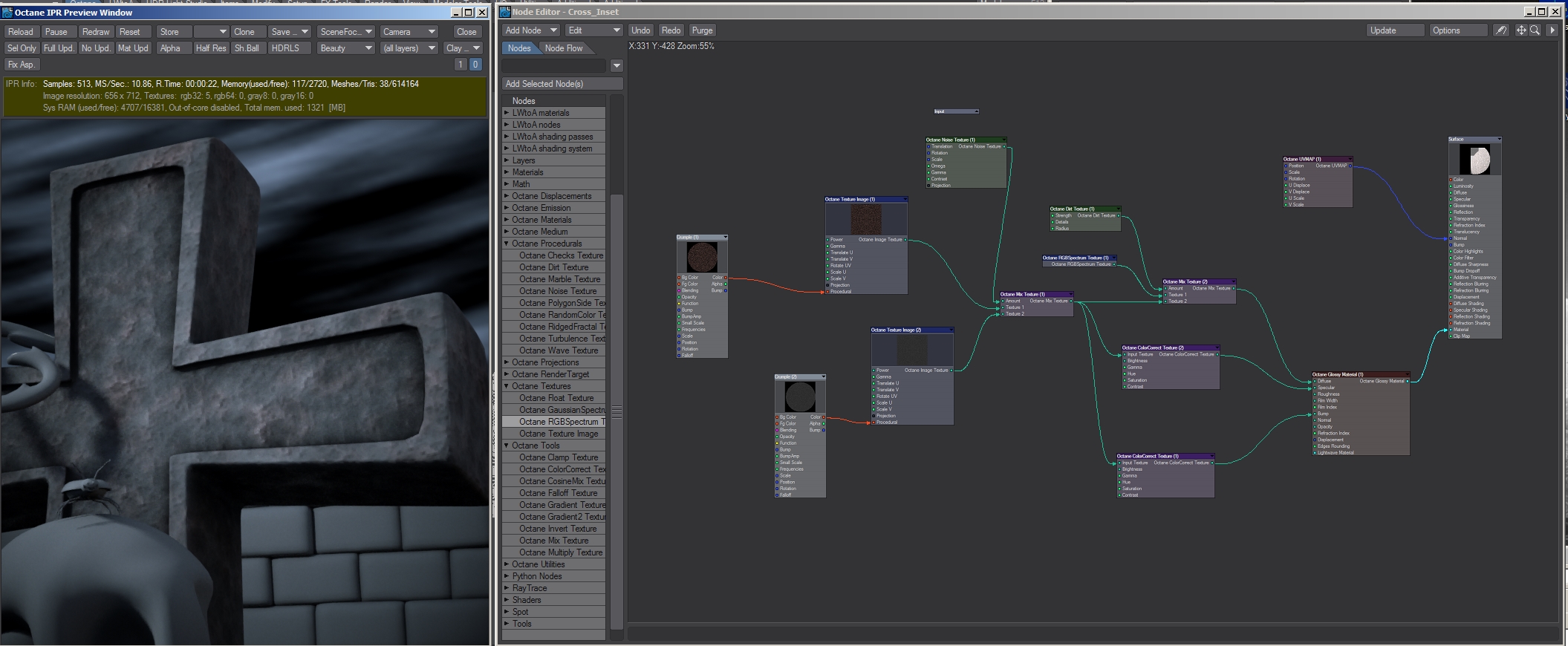 In the tutorial, he applies a procedural turbulence bump map to the cross behind the skull and then makes adjustments to the diffusion, specularity and glossiness channels. From there, he applies a procedural dented texture to the diffusion channel and the object maintains the environment's color. When I try to replicate this through Octane, I get very different results. So, I'm turning to the LW Octane community for some guidance