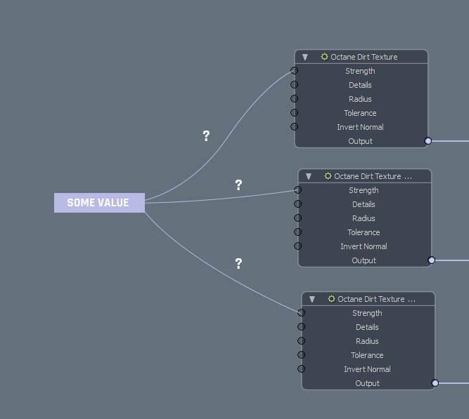 The Dirt Strength is a number, not a texture, so your "Some Value" node needs to be an Octane Float Value (not a texture) and you can then plug it in to multiple Dirt Strength pins.