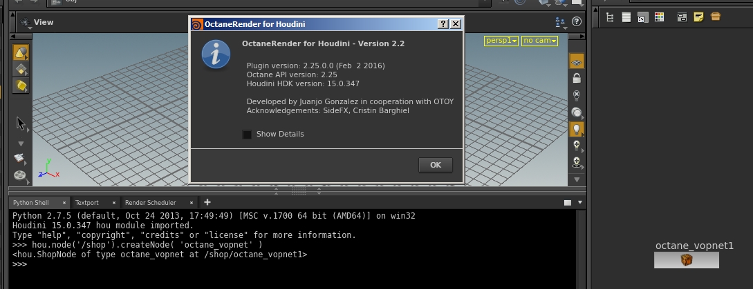 This python code is hanging houdini : hou.node('/shop').createNode( 'octane_vopnet' ). Works fine if the node is a mantra node. We are building a "uber" shader network with some promoted parameters to be more artists friendly and serve as a lookdev starting point. When we call this node in a python script (this script automates some image map connections) we get a frozen houdini.