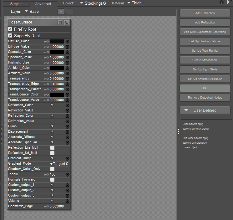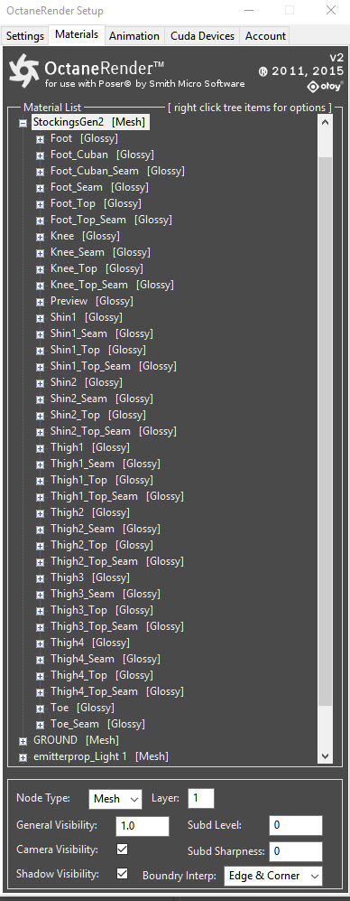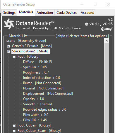 Based on the Poser material for "StockingsG" I do not understand how the Firefly is interpreting that to produce the 2 bands at the top of the stockings at "This is a basic render of the stockings in Poser firefly". How you got the right material? There would need to be at least a transparency map to produce those two bands at the top of the stocking. I wonder if there is other geometry involved?