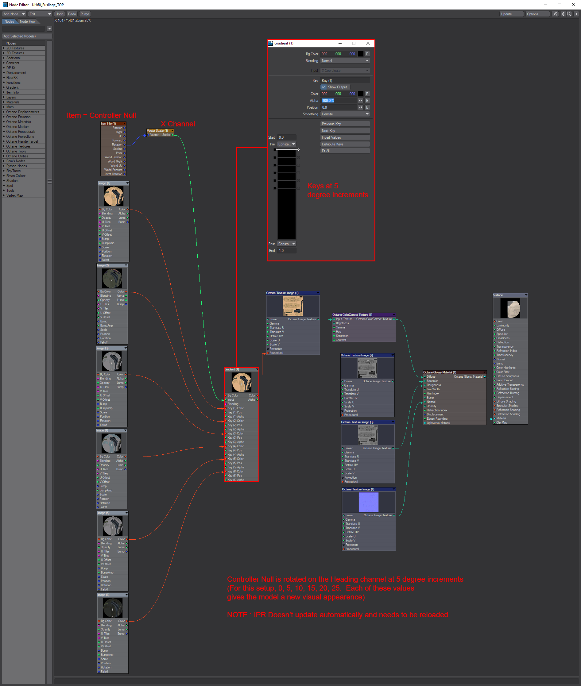For example, I have an object for which I want to have several variations of (different texture maps applied), and thought that instead of having a bunch of different object taking up valuable storage space I could have a single object with all the texture maps applied using an Octane gradient and then linking the 'input' of the gradient to the rotation channel of a Null, so that when I rotate the null in (for example) 15 degree increments the textures change. The setup is pretty much the same as the random colouring of Instances, but the problem I'm having at the moment is that I can't seem to find a way to get the Nulls rotational information into the input of the Gradient node (incompatible LW/Octane nodes etc.)