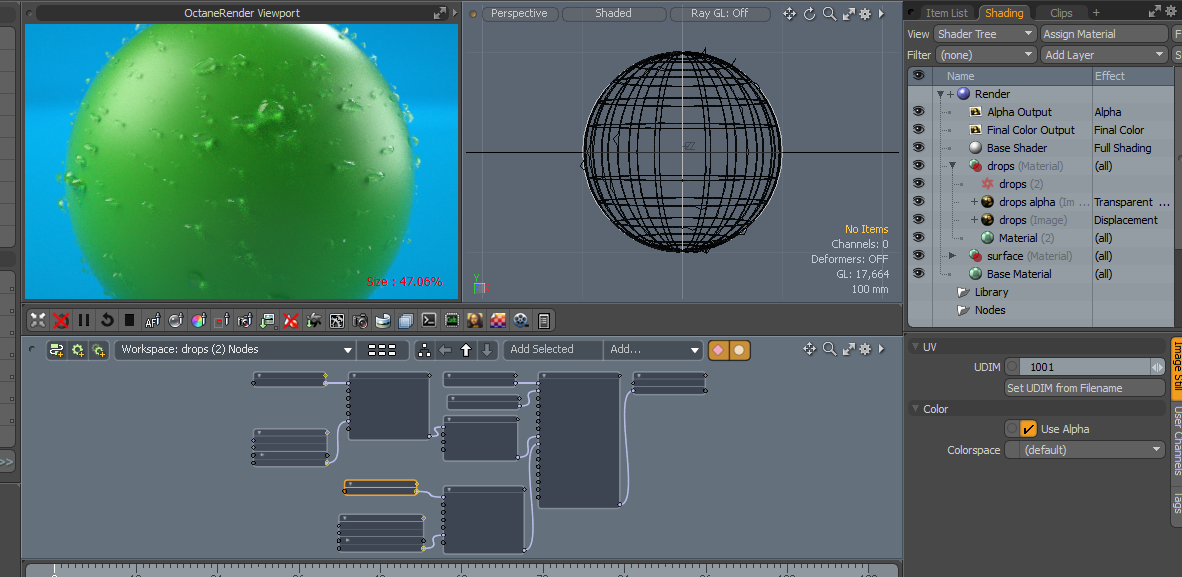 Gave the UV mapping a shot which produced a slightly better result but still getting some interaction when the drops get too close to the base. The drops get a bit floaty when I push them away from the base to combat the issue.