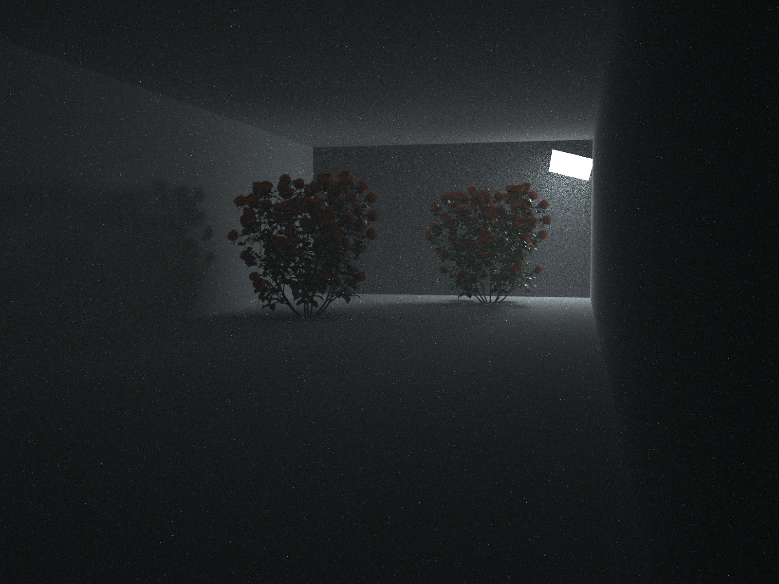 I have created a new black environment node with medium, reduced the light dimensions, moved it a bit behind the roses, and here is the result: