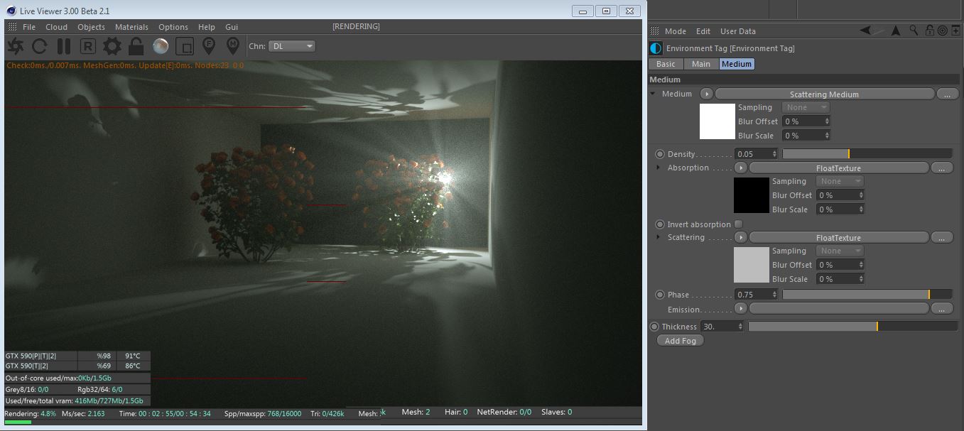 Definitelly the fog factor kicks in, but it's just scattering... where are the godrays? this looks like a cirscunstance where they would show up. if i crank the values the scene just washes out and don't get to see the effect.
