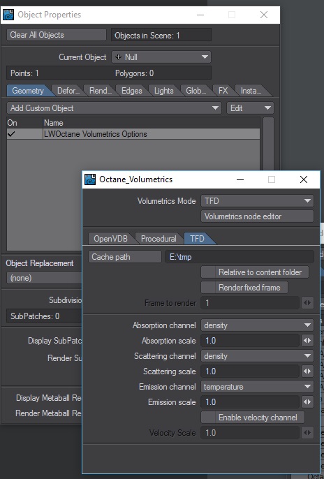 Anyway working with TFD and the LW plugin is fairly easy. The plugin works with the TFD cache files. You only need to add the Octane_volumetrics custom object plugin to the TFD container object, set the volumetric mode to TFD, select the path of the TFD cache files and select the grids used by Octane to render the volume.