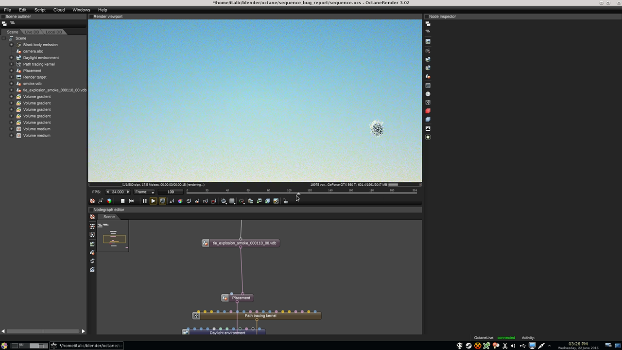 I have a sequence of VDBs in my current project from my blender smoke cache, the first of which starts on frame 108 of my Octane project. However, Octane refuses to load the first VDB in the sequence. I'm assuming the file is empty, because the scene has no smoke in it and the file itself is only 4kB on the disk (compared to frame 109 at 160 kB). This isn't inherently bad, but it becomes problematic when I start the VDB sequence in the middle of the project; if I load the sequence starting with frame 109, it then holds frame 109's VDB file until frame 110 (every frame < 109 displays 109's VDB). This is problematic because there shouldn't be any smoke in the scene before 109. To compound this, emissions are also enabled for all those previous frames. I think it's Octane's problem reading the VDB because I can open the same VDB sequence in Maya and it scrubs through from beginning to end. I can't change the looping method in the VDB sequence window because I don't want it to loop or ping-pong.