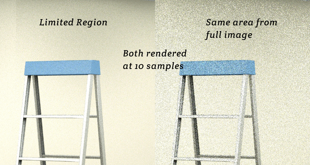 I thought I could select a limited region of the large image and then do some test renders by increasing the samples until I got a nice noise free image. Then when I have it right I would then disbale the limited region and render the full image. From my test I don't think that works as I am obviously not understanding what the samples means. Because when I did my test render the using the same amount of samples the limited region version was smoother than the full image. so I'm guessing that the render samples also takes into consideration the size of the render in some way. I though it meant samples per pixel. Can you help me understand this please?