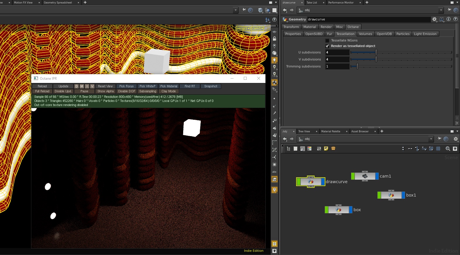 Any tips? I'm fairly new to Houdini so probably a simple fix, just couldn't figure out why they show up in the viewport but not in an Octane render. A basic cube using the same emissive material renders just fine as you can see. Here is my scene file and some screenshots: