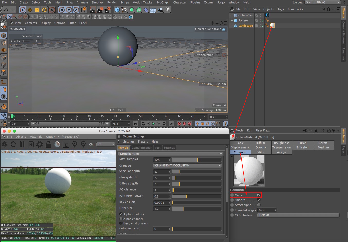 Here is my story: have tracked a camera-sequence within C4D and within that scene there should be build up the customers logo – strait forward. The logo itself is on a plane which should simulate the shadow. Create a background object and but the scene into a material – enabled the Alpha Channel so that you can see in the Live-Viewer the Scence itself. Put the Octane-ObjectTag with Layer-ID 2 on the plane (to simulate the shadow), everything else is on Layer-ID 1. Enabled the Render Passes, Enabled Render Layer, Enabled Shadows – everything works fine, looks good, shadows are rendered – BUT I have to switch on EVERY image between (Main) and (LSh) on the Live-Viewer to control the shadow – and get only either the image or the shadow – VERY BORING – is there really not any function to get the final rendered image with shadows in the live-viewer? Have I overseen something – I guess - I’m using C4D R17 – Octane 2.25 R3 – I did a screenshot of all necessary information.