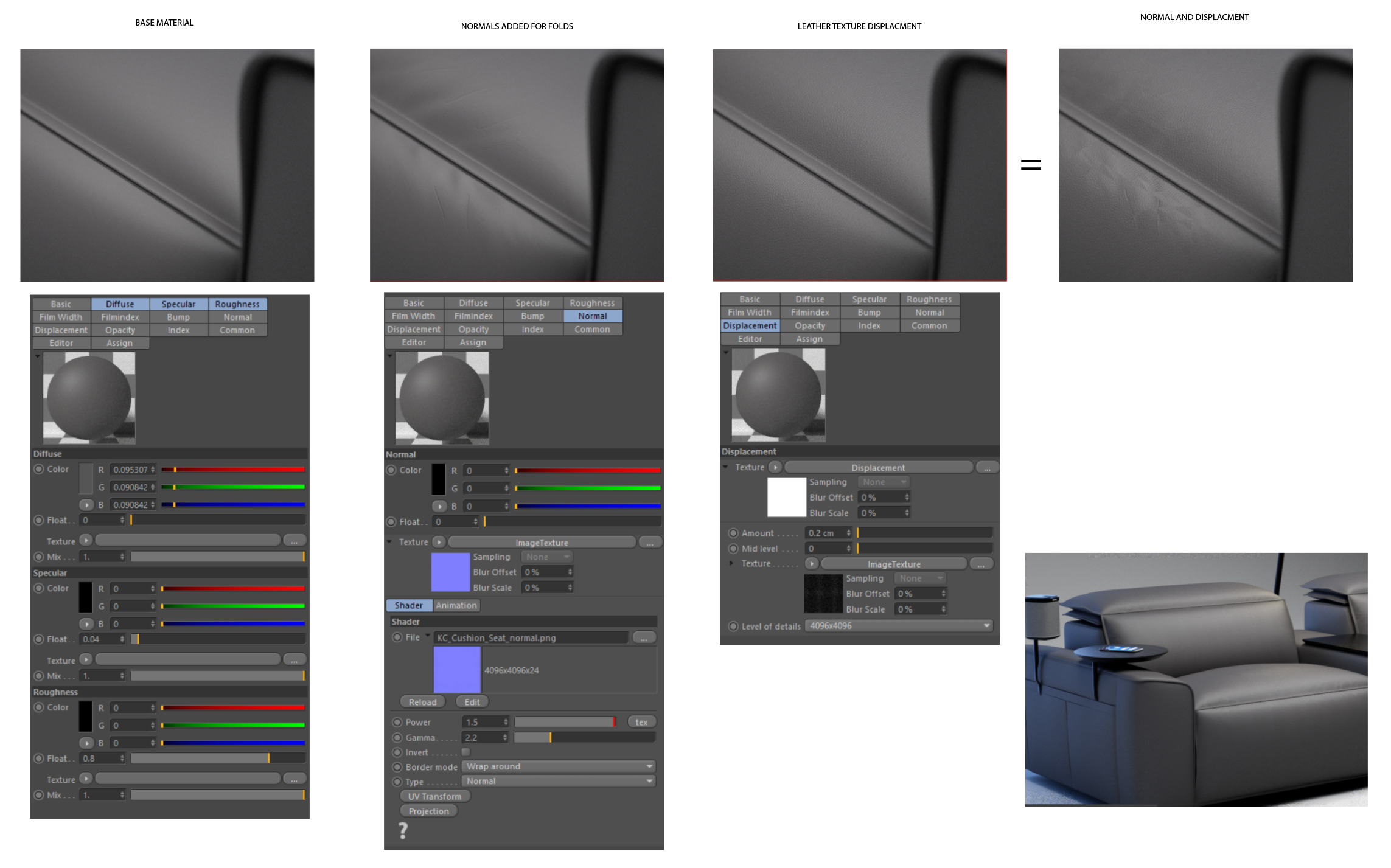 I have a material that i add a displacement map to (4096 x 4096) this creates the leather grain which i am happy with.