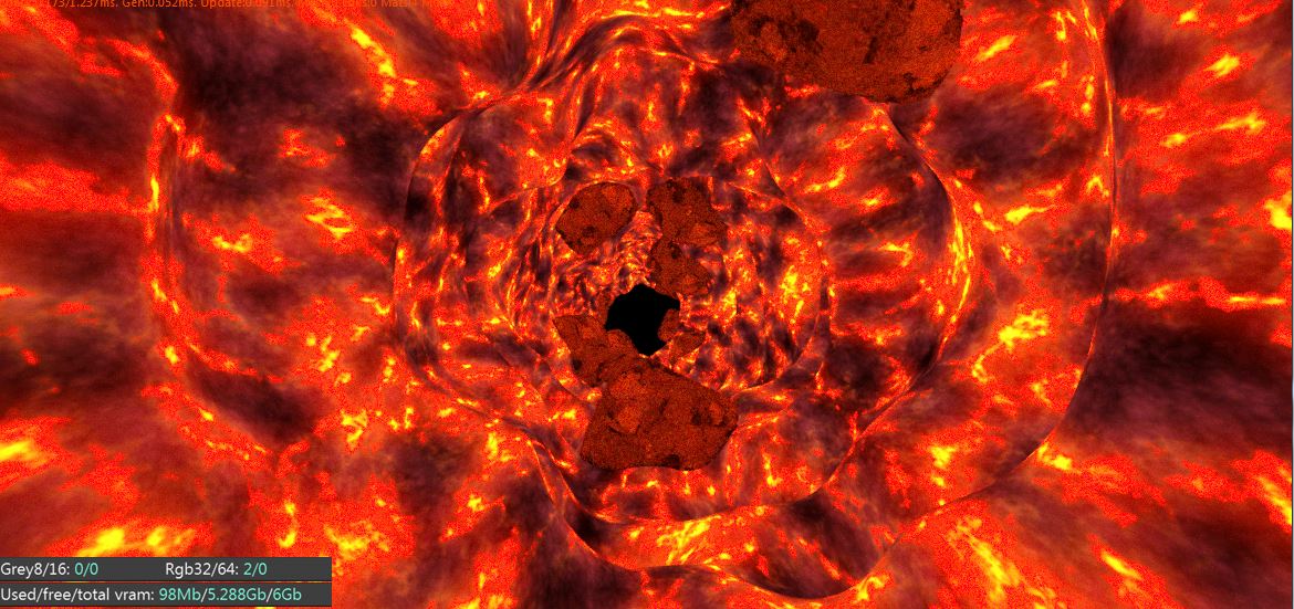 Its a tube of lava that the camera will fly through. I have rocks cloned along the tube. As you can see, the rocks showing on the outside get global illumination, so they're orange. But the rocks inside the tube are black because global illumination can't make it through the tube object.