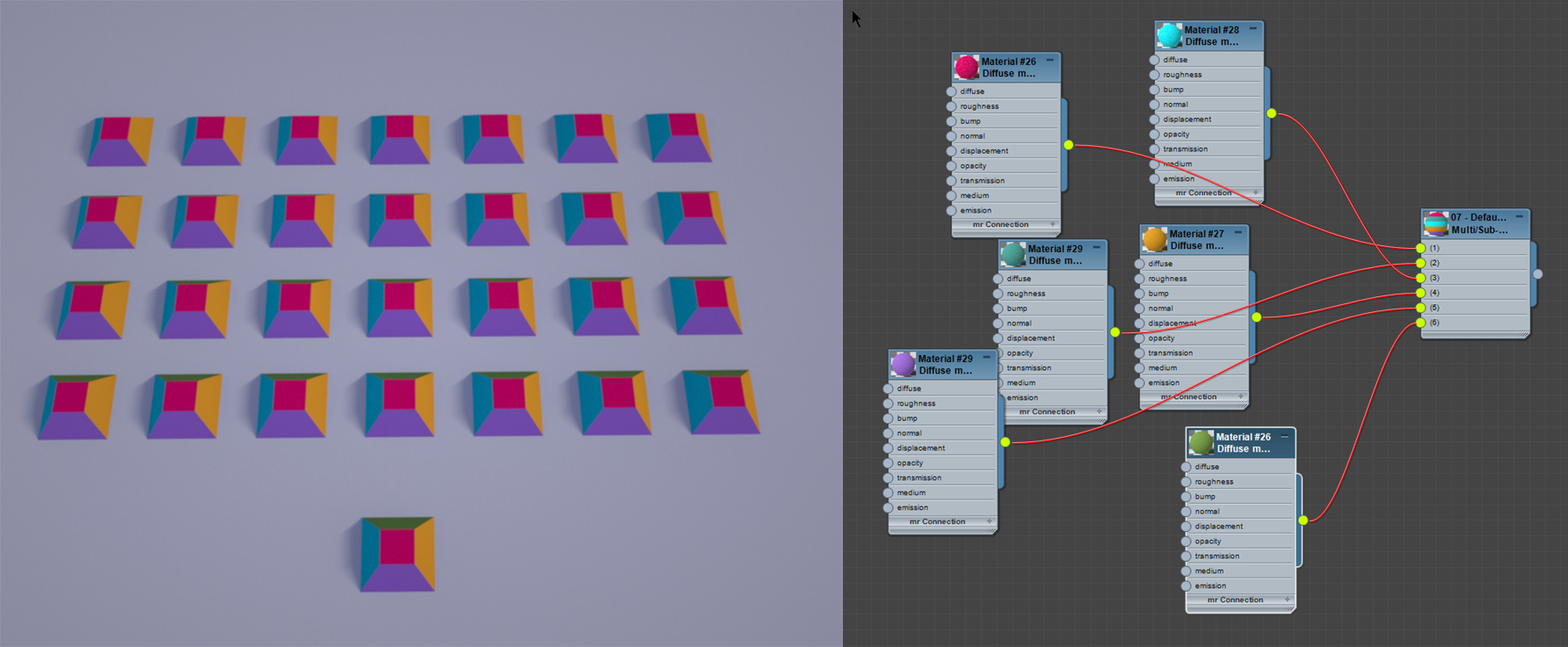 Below objects have different Material ID's on every polygon. Here I didn't use the Random Color Tex as mix Amount yet