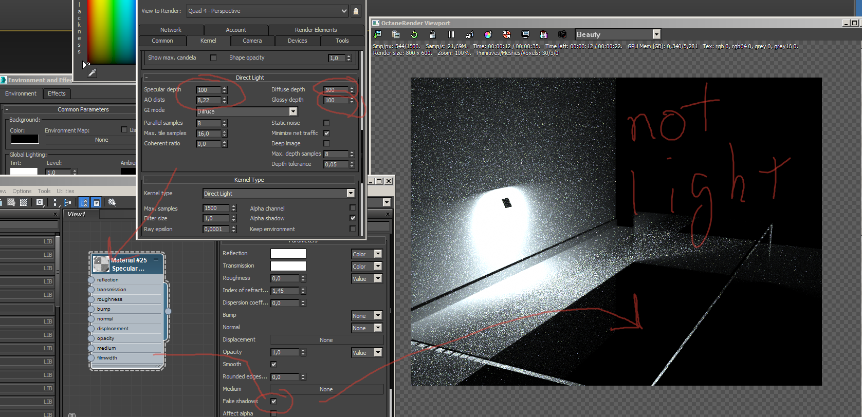 in diffuse direct when the glass has the property of fake shads I don't see that it was missing the light itself
