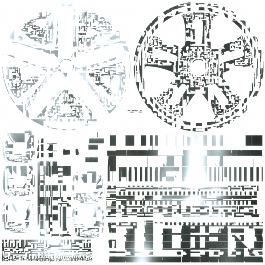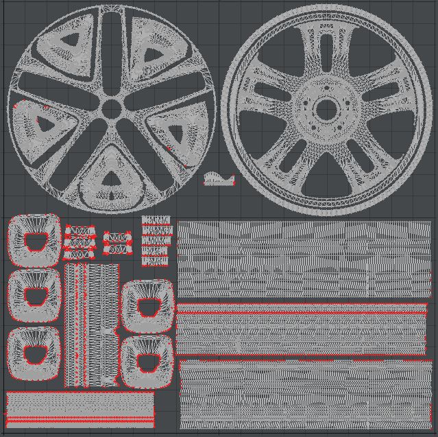I created the UV map for the wheel by cutting out the inside areas of the spokes, creating object morphs for them and flattening them out, manually dragging points here and there to keep geometry from overlapping then making planer UV's for everything besides the outer and inner edges of the wheel, where I used cylindrical mapping. Then I put everything back together and merged the points. All triangles.