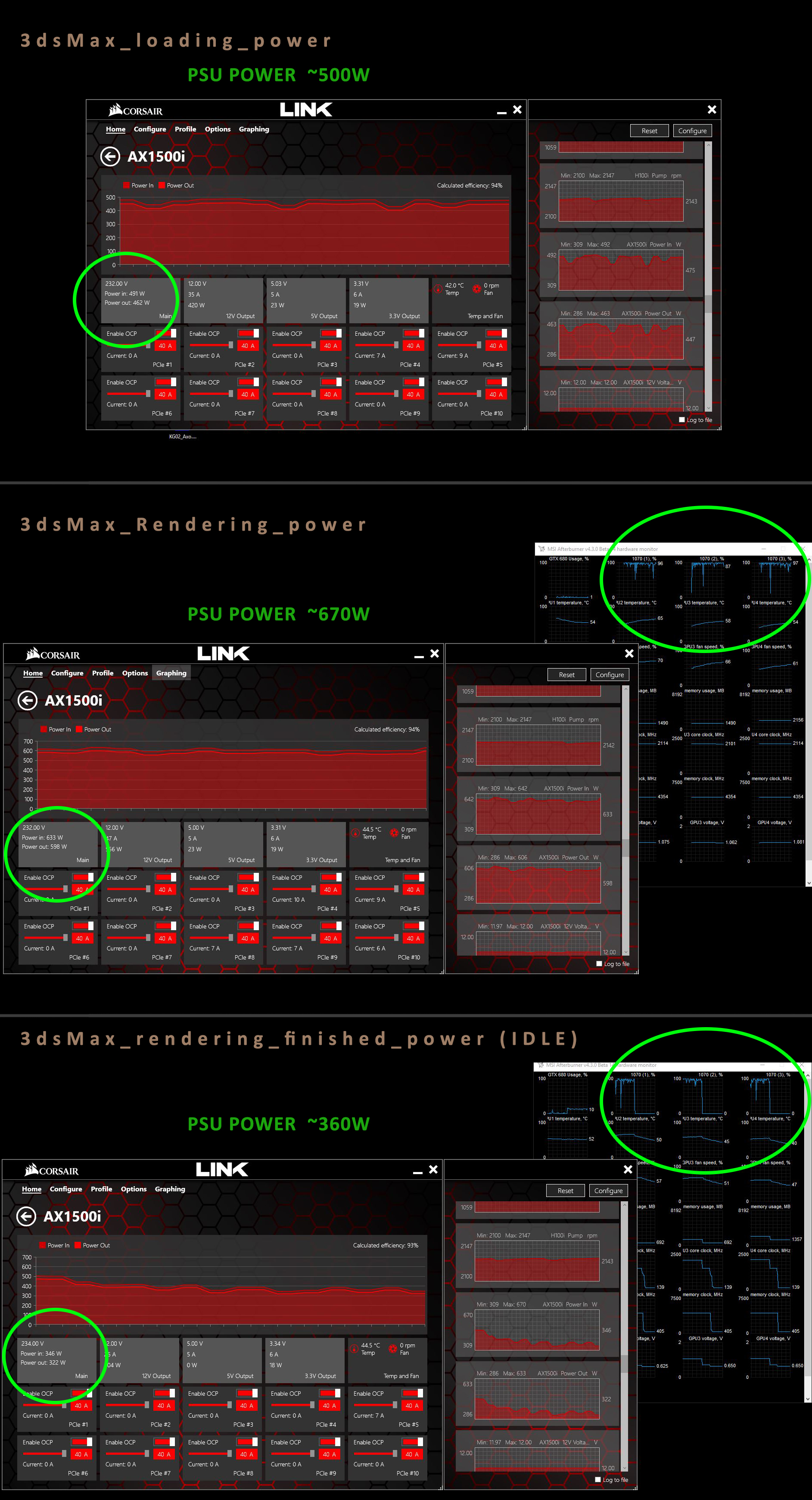 AX1500i is capable of monitoring power draw from outlet and power out (to the mainboard). Not sure how precise this is but here goes.