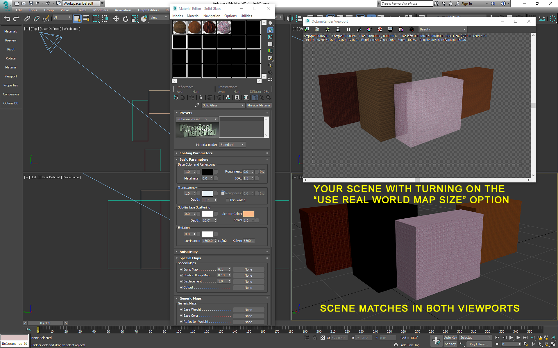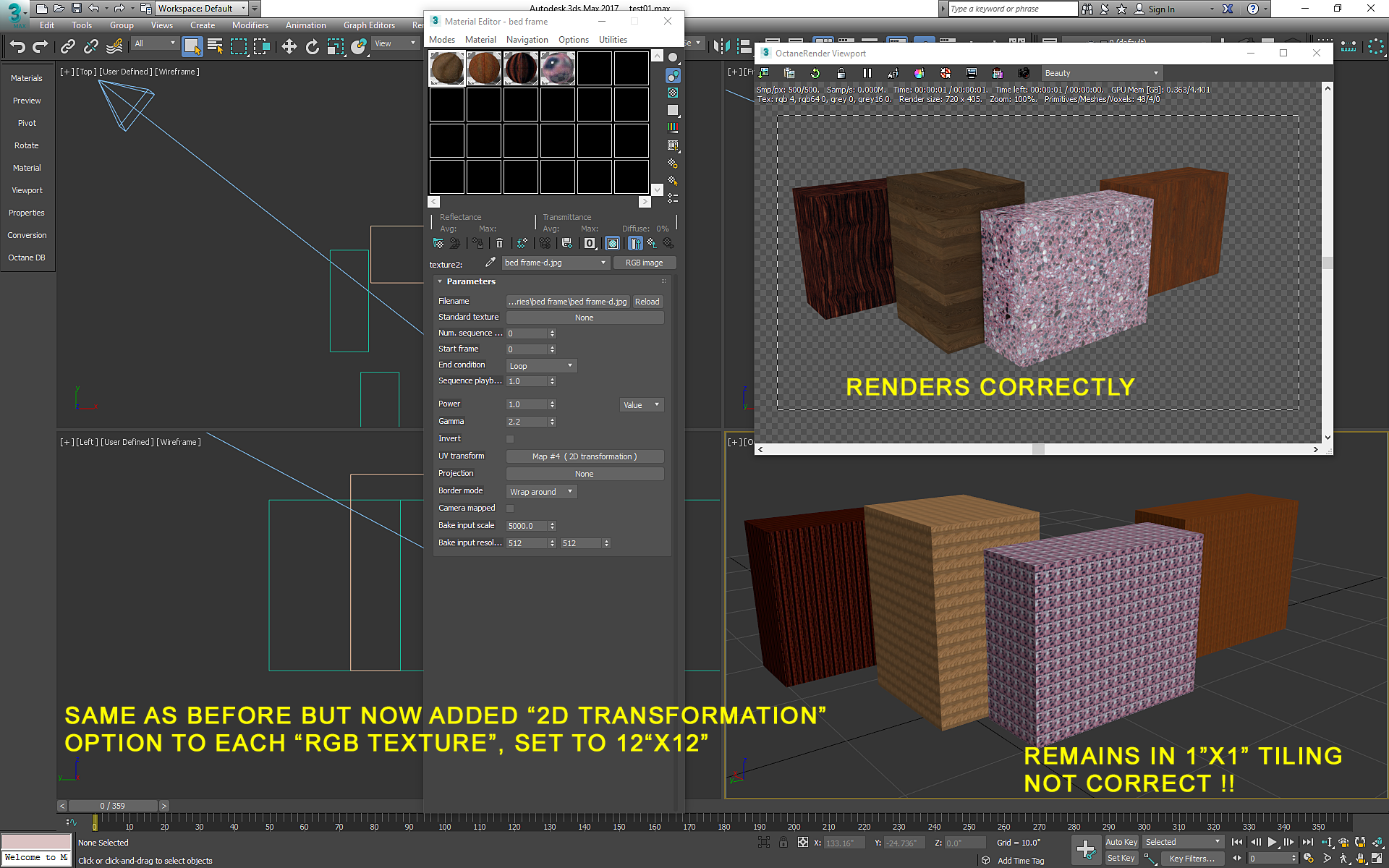 Just to be clear, this is ONLY A PROBLEM with "USE REAL WORLD MAP SIZE" turned on. The problem is with the "2D TRANSFORMATION" under UV transform. The 3dsmax working viewport does not respect changing these values away from 1x1, but the actual OCTANE viewport does. At least that is something, but it makes it difficult to work with the scene in the standard viewport. And it used to work on every version up until 3.0