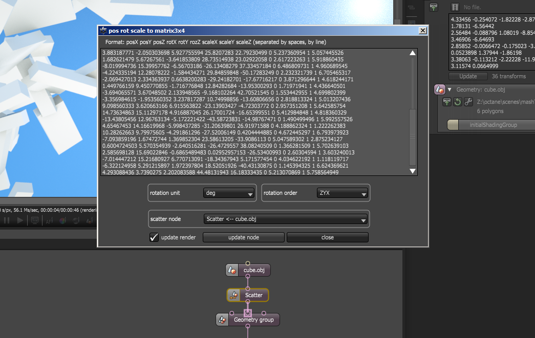 Paste a list of positions, rotations and scales and assemble your matrices in octane.