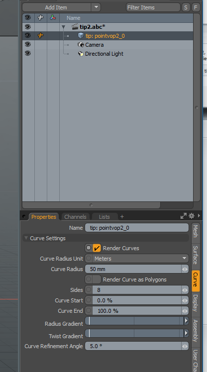 File->Open->tip2.abc. This results in a mesh item where you can tick the Render Curves checkbox.