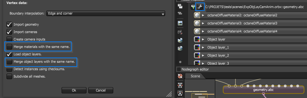HMXMedia wrote: 1) Right now .abc node is compact and merge even we click check off merge materials as well as objects with same names from main octane standalone preferences under import alembic settings not sure why opened scene is not obeying preferences options?