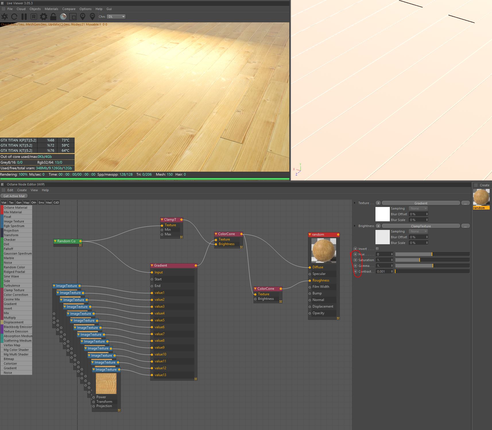 Yeah that would be awesome. If you could expose somehow the Hue, Saturation, Gamma and Contrast values to the random node we could create some better randomisation. If you see in my parquet example its pretty straightforward what I'm trying to achieve random values for each plank, gamma hue etc.. I would go as far as suggest that a random rotation of the texture to flip etc would be nice if it could be implemented for example map the random node to rotate in 0 or 180 from the UVW project node. Maybe all that can't be done and are limited by the core, I don't know, Ahmet is the guy here, he can shed some light. You can test my simplified scene also and see what I mean.