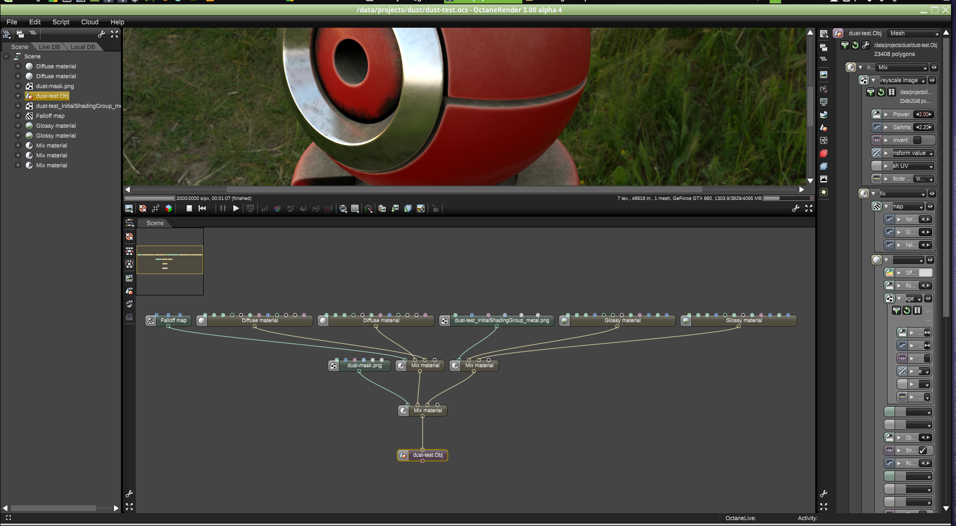 The dust is an additional layer that is mixed in. In this case I use a custom smart material to generate the dust mask. The mask is used to control the mix node, the same as for the metal map. The dust itself is just a diffuse materials with a falloff so it has white highlights. I also used the mask as a bump map to give the dust some depth. The dust material gets plugged into the first pin, the combined material in the second.