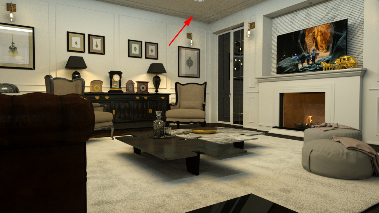 Maybe you could try noise reduction in post, so isolate just that material (render passes , material ID/layers) of ceiling and then apply NR on just that.
