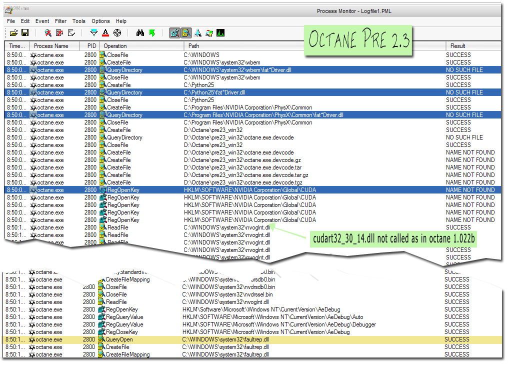 HKLM\SOFTWARE\NVIDIA Corporation\Global\CUDA. Octane 1.022b goes on to access cudart32_30_14.dll whereas Pre2.3 does not. Pre2.3 does a few more things then proceeds to crash with the fault report and Dr. Watson while 1.022b happily continues.