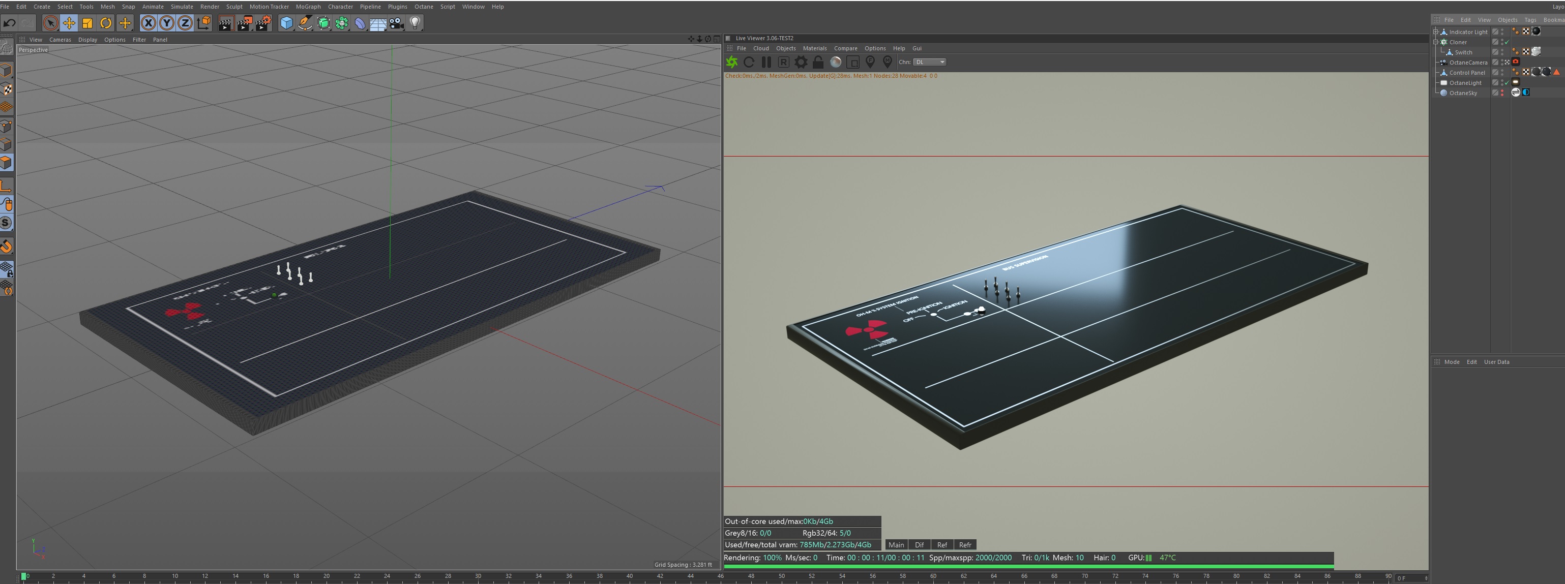 I'm working on a control panel/interface. Designing the texture in After Effects and exporting that as a .PSD (8196x4096) for Octane.
