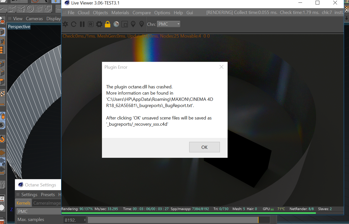 aoktar wrote:Open bugreport.txt and check top lines. If it's like that: "octane.dll: Octane::RenderResultStatistics::progress...." so it's about renderer.eyeonestudio wrote:3.06 PMC Kernel : Not Stable