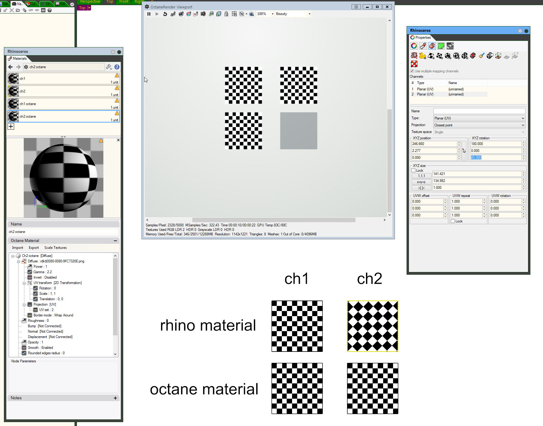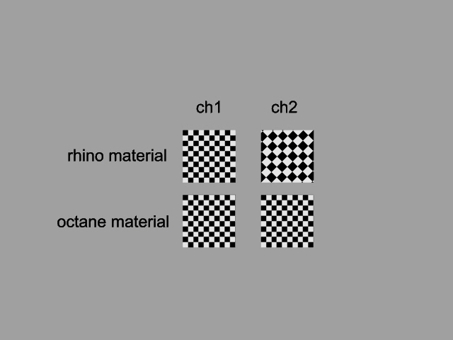 A- if a rhino material uses channel 2 and is rendered via octane it renders like using channel 1