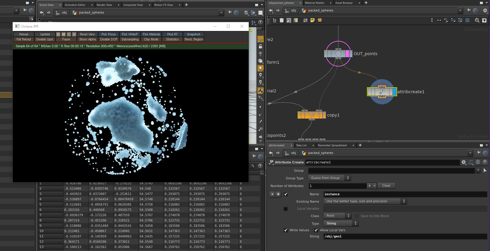 Below you see what the output presently looks like, rendered with OctaneRender, with the output being produced from a copy stamp SOP instancing circles. I was hoping there'd be a faster way still with packed instances via the copy SOP (in the current form where the shapes being rendered are spheres, I am aware I would be able to create this effect with the particles, but I was hoping to go for a more complex being instanced still once I get the basics right):