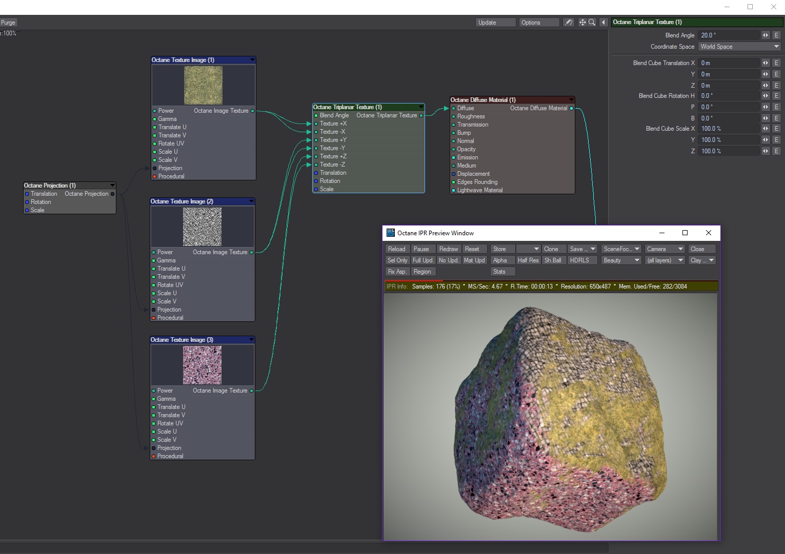 Each of the 6 blended textures can be set up independently and has its own projection providing maximum flexibility, but to allow the quick setup of the most common use case, we added a new triplanar projection node, which only works for textures that are inputs of a triplanar texture node. What internally happens is that the triplanar map texture calculates the UVW coordinates, which are then passed to the input textures and used by the triplanar projection. Of course, you can still use any other projection if you want.