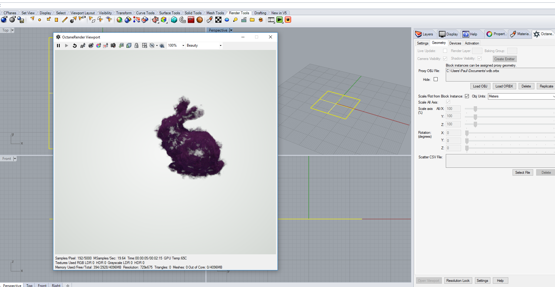 In Rhino I created a box, turned it into a block and linked the previously created .orbx file within the octane render tab 'Geometry'.