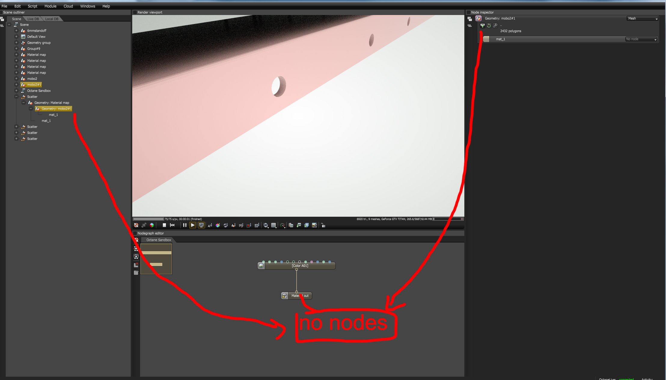 * The Node Graph Editor (bottom left) depicts a "sandbox" that shows only the material nodes (and linker nodes connecting them to the geometry); the rest of the node graph (geometry, rendering options, etc) is hidden. You can manipulate the material nodes in the same way you would in the Octane standalone app. Can we have geometry nodes visible?