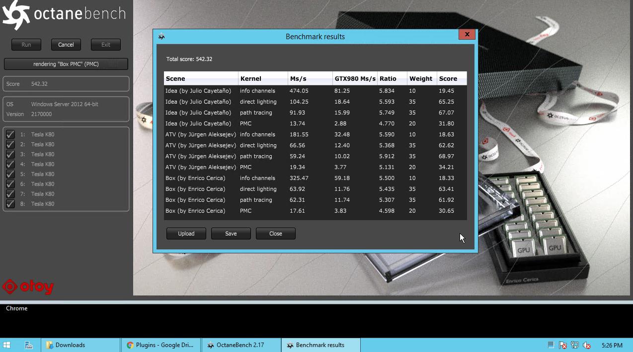 Tesla k80 is a dual gpu, so 8gpus means actually there are 4 physical cards attached. Also k80 is Kepler based architecture, so for around 550 octanebench points, it's not supprise at all..how does that only score 542?!