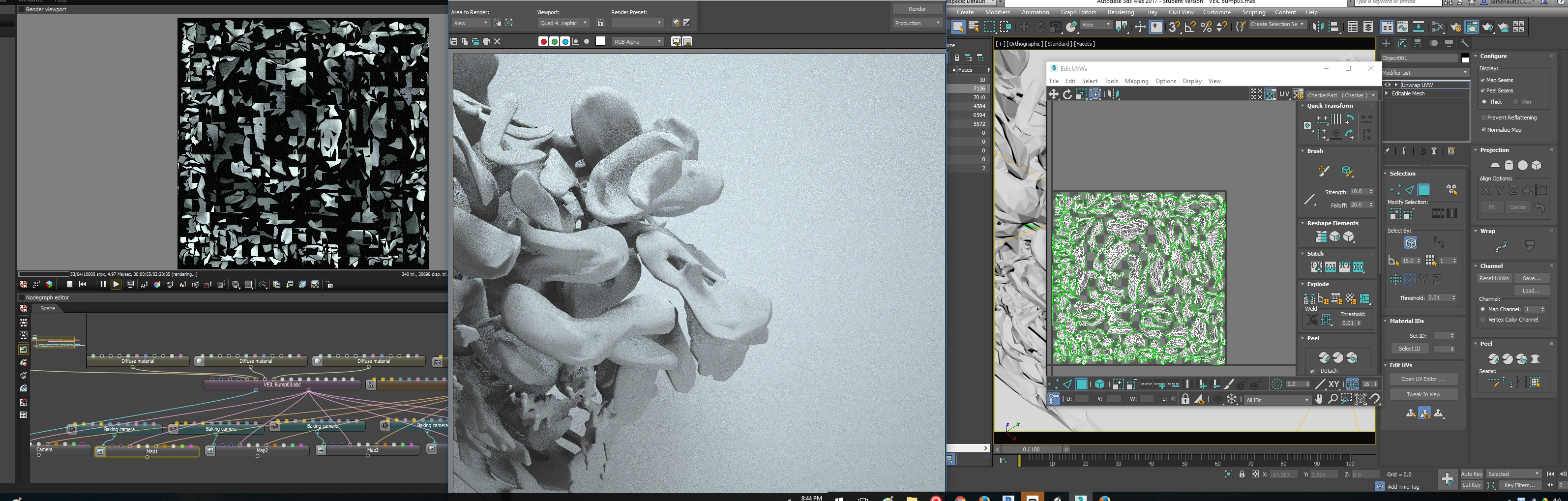 These are the results and my 3ds Max screen showing the UVWs and the original geometry. You can see the map on the left is broken up.