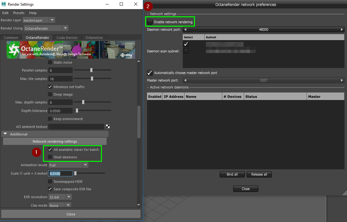Are you able to see all the Slave daemon nodes from the Master's Octane render network preferences dialog?