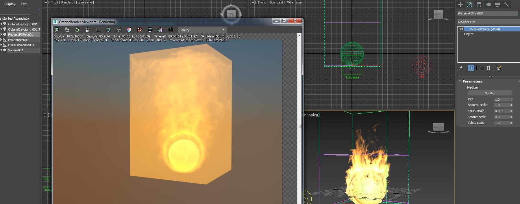 In PhoenixFD fire object preset, on the default VRAY max render getting just the ball and fire emission, but on Octane getting the volume radiating/filling the whole container 'box'.