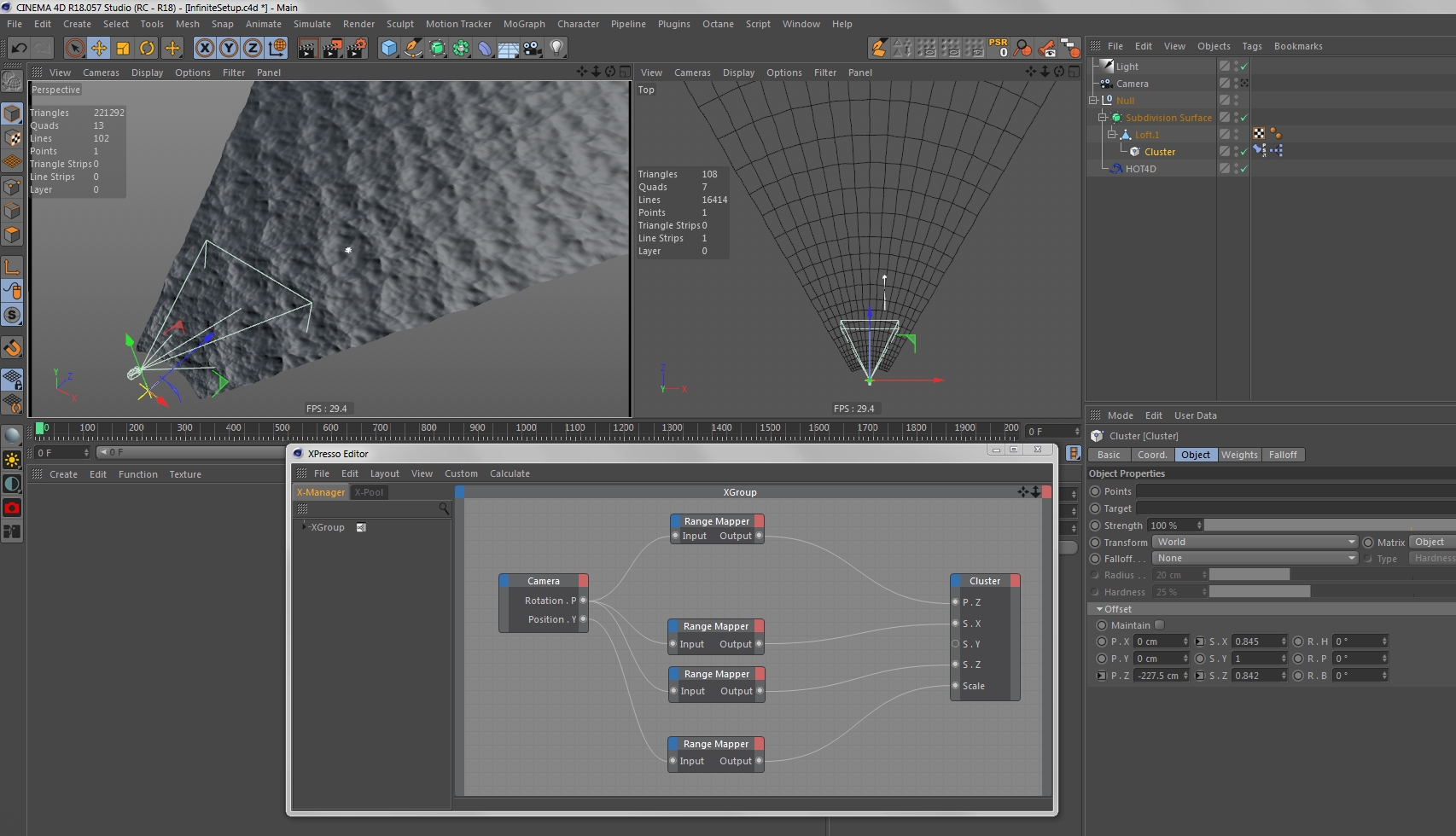 I went ahead and pretty much applied this method based on your prev post - using your idea of the geo falling off in a fan shape, with less polys in the distance and the cluster rig from Valkaari, which helped to pin the HOT4D deformer down (essentially doing a world space deformation on the moving plane).