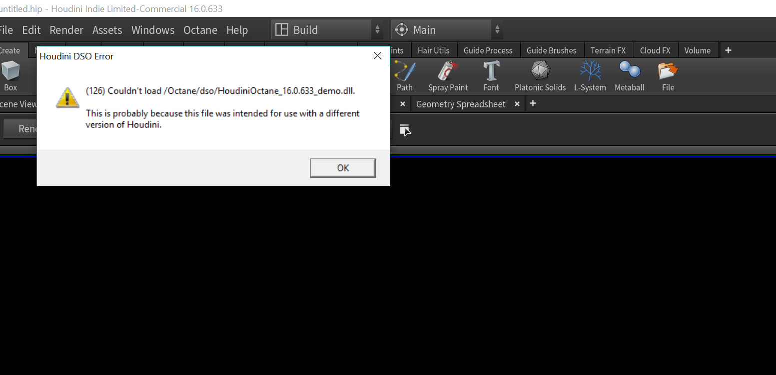 system is win10 and houdini 16.0.633 is installed in the default path.