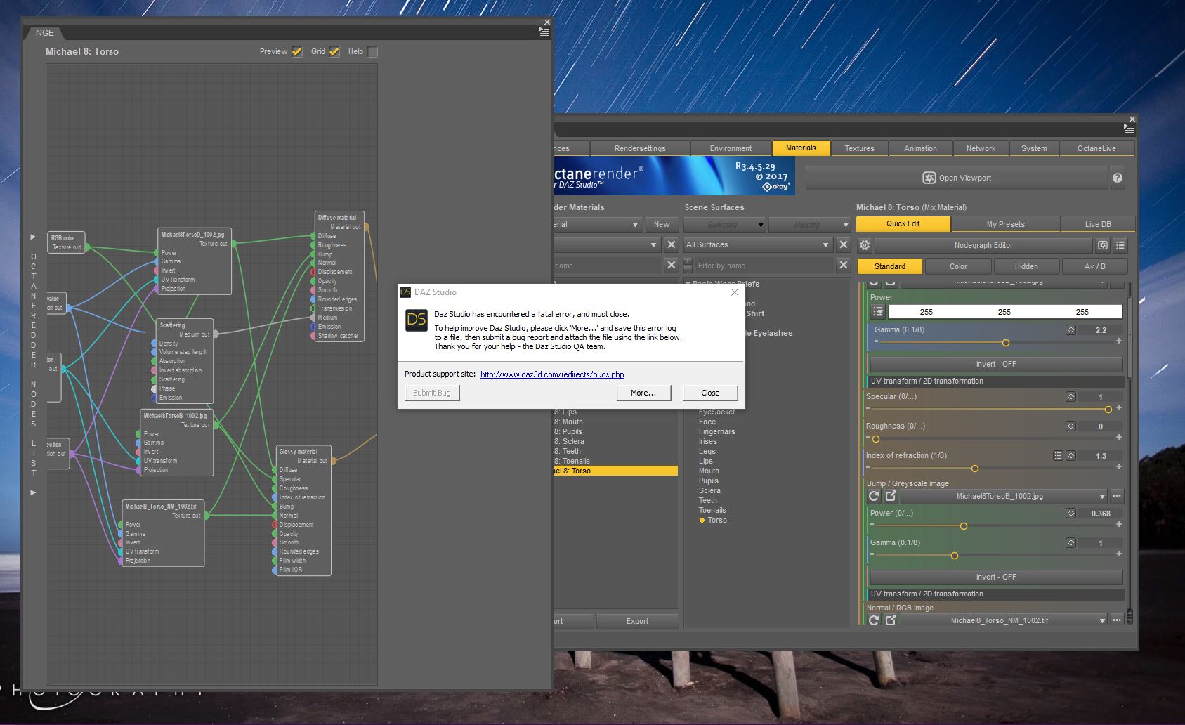 The crashes, however - when I load a character in Daz 3D and it converts the mats, when I go to the octane material list and select Torso, for example, the nodes load (the other bug is present here too, can't add anything) but when I select the scattering node or change other nodes, it crashes. I couldn't get it on video as it was working fine now, but it's still unusable without being able to add nodes.